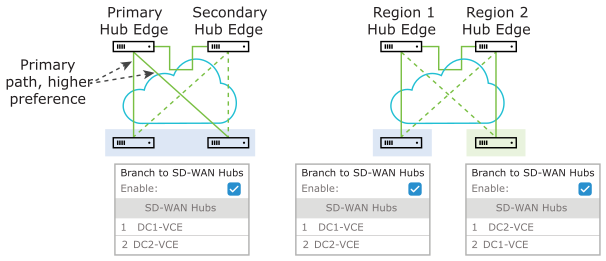 Hub or Cluster Interconnect VeloCloud SD-WAN supports interconnection of multiple Hub Edges or Hub Clusters to increase the range of Spoke Edges that can communicate with each other. This feature allows communication between the Spoke Edges connected to one Hub Edge or Hub Cluster and the Spoke Edges connected to another Hub Edge or Hub Cluster, using multiple overlay and underlay connections. See Hub or Cluster Interconnect.