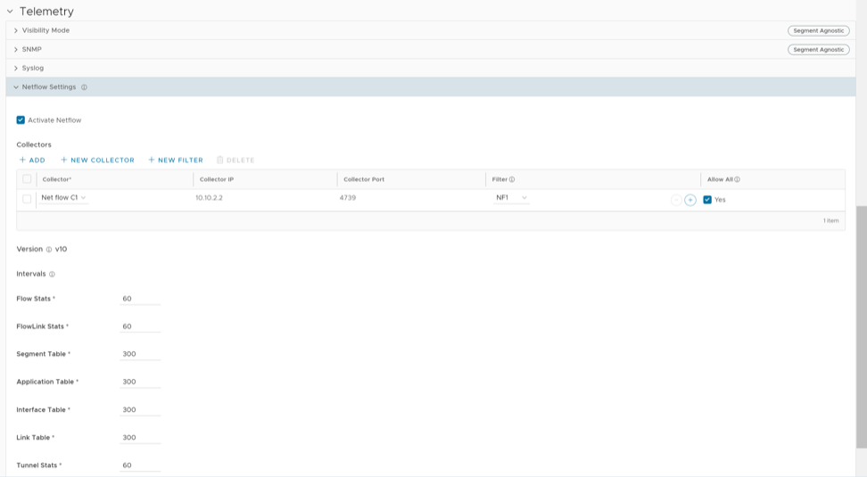 Note: In an Enterprise, you can configure the Netflow intervals for each template only on the Global segment. The configured Netflow export interval is applicable for all collectors of all segments on an edge.