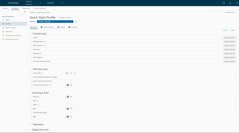 In the SD-WAN service of the Enterprise portal, when you select Configure > Profiles and select a Profile. The configuration options for the selected Profile are displayed in the Device tab.