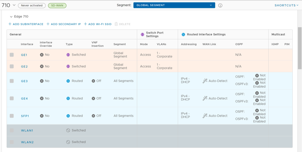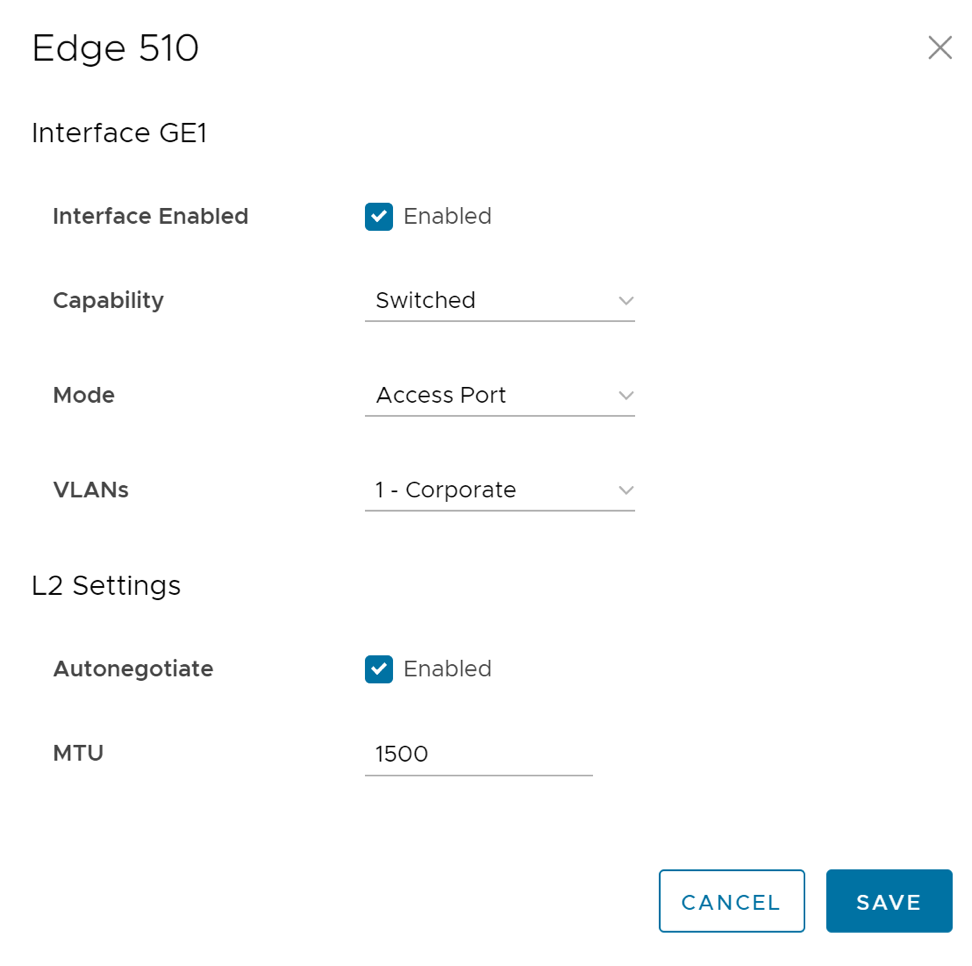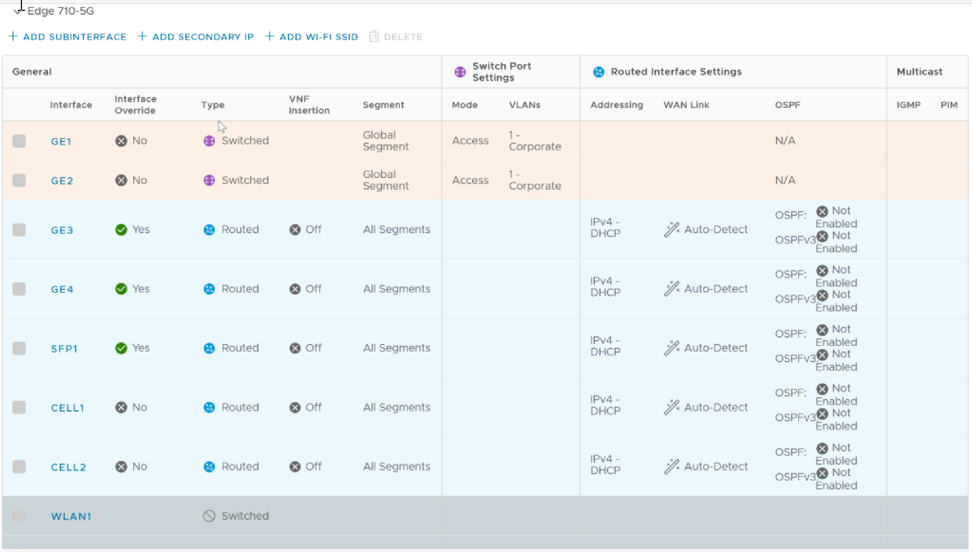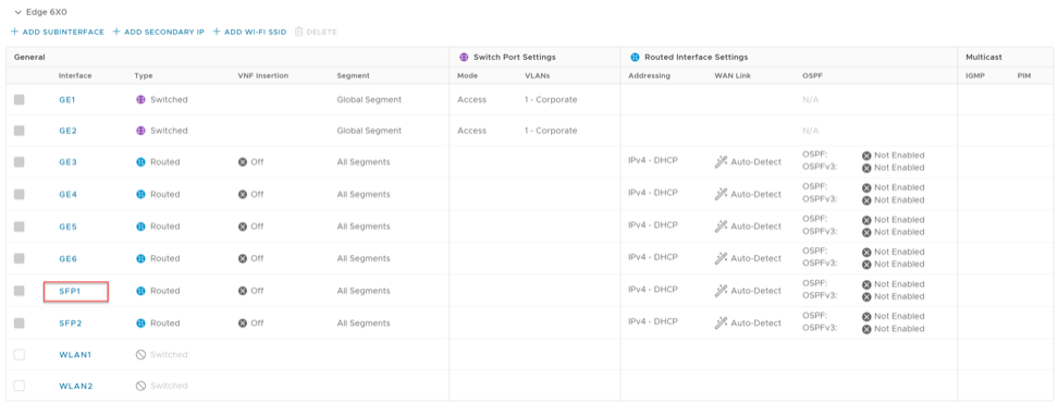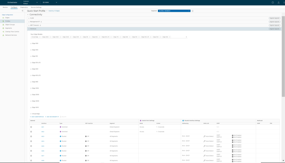 Interfaces Configure the Interface Settings for each Edge model. See Configure Interface Settings for Profile.
