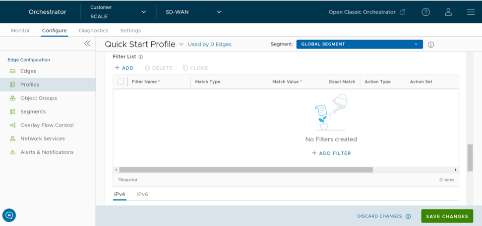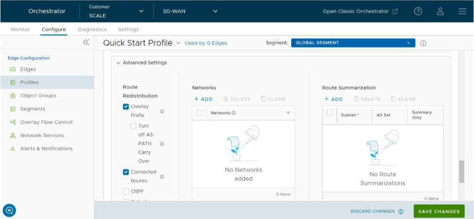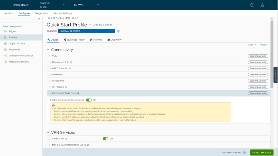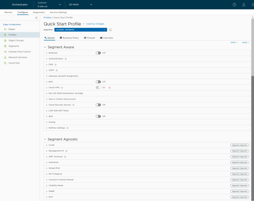 In the SD-WAN service of the Enterprise portal, you can perform various configuration settings for a Profile by navigating to the Configure > Profiles > Device tab. For additional information about Segmentation, see Configure Segments with new Orchestrator UI.