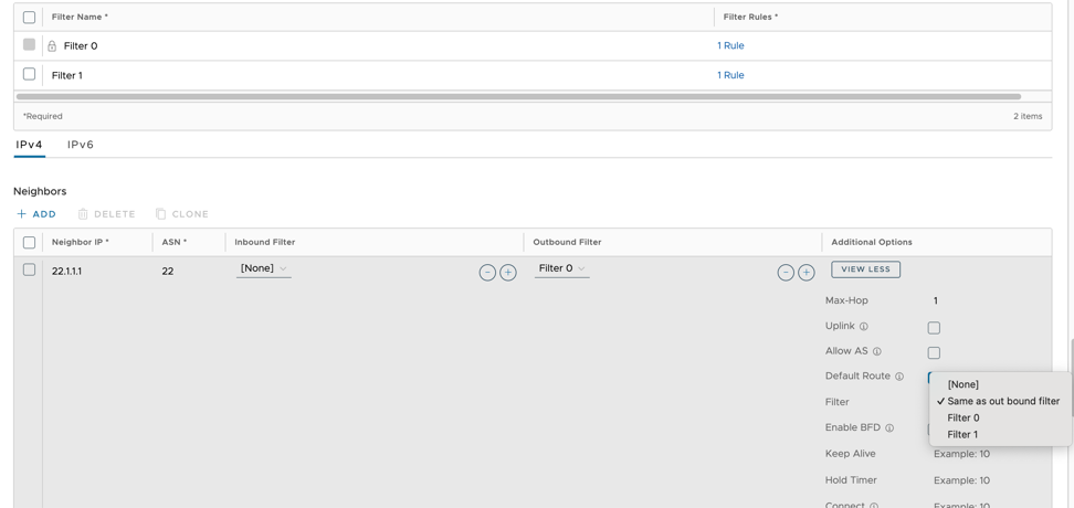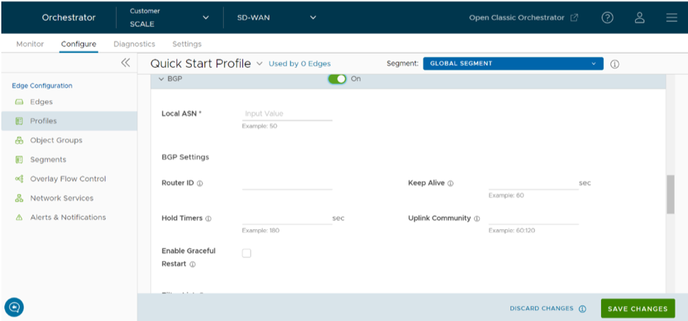 BGP Configure BGP for Underlay Neighbors and Non SD-WAN Neighbors. See Configure BGP from Edge to Underlay Neighbors for Profiles.