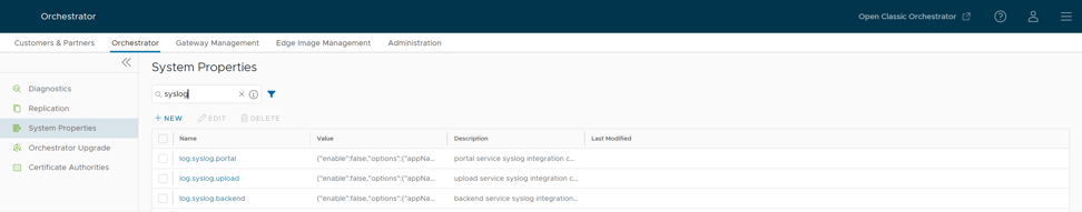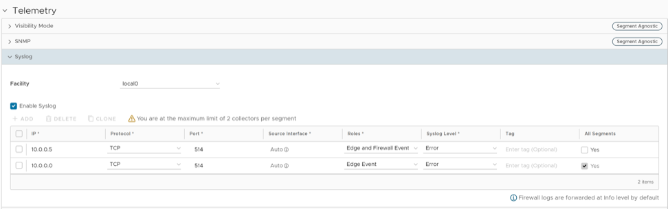 Syslog Configure Syslog collector to receive Orchestrator bound events and firewall logs from the Edges configured in an Enterprise. See Configure Syslog Settings for Profiles.