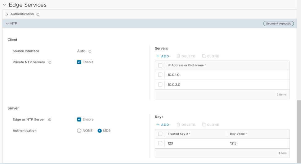 At the Edge-level, you can override the NTP settings for specific Edges. For additional information, see Configure NTP Settings for Edges.