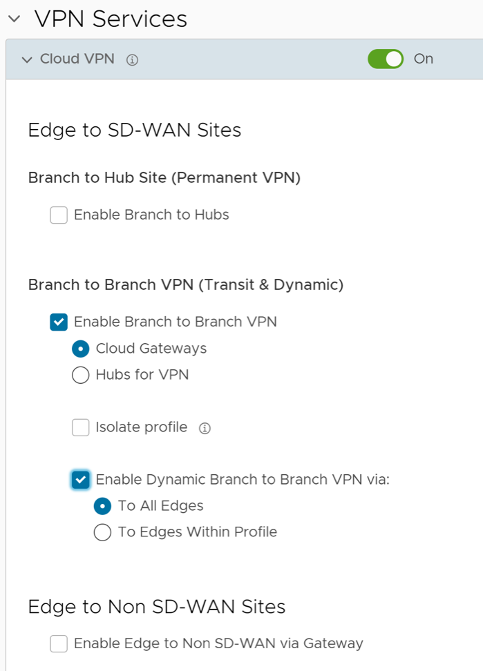 Non SD-WAN Destination via Edge Activate to establish tunnel between a branch and Non SD-WAN destination via Edge. See Configure a Tunnel Between a Branch and a Non SD-WAN Destinations via Edge.