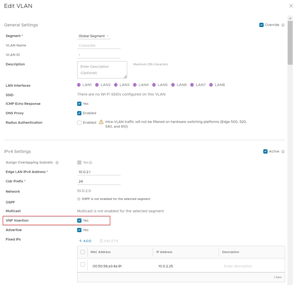 At the Edge level, you can add a new VLAN or update the existing VLAN settings inherited from the associated Profile. While configuring a new VLAN at the Edge level, Orchestrator allows you to configure additional Edge-specific VLAN settings such as Fixed IP addresses, LAN interfaces, and Service Set Identifier (SSID) of Wi-Fi interfaces.
