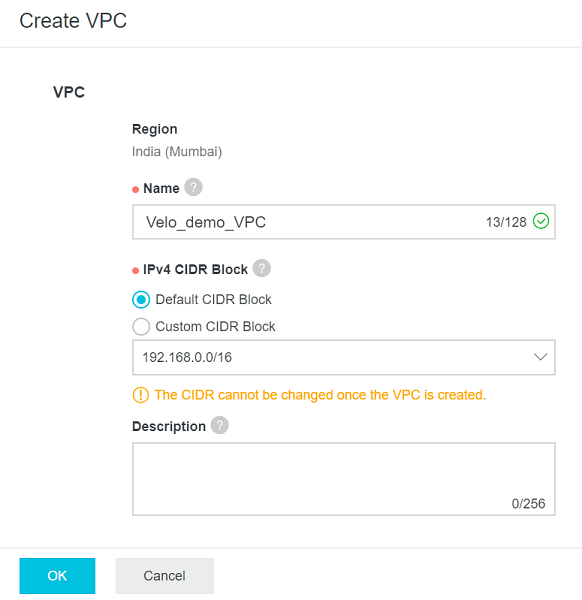 Default CIDR Block: Select 192.168.0.0/16, 172.16.0.0/12, or 10.0.0.0/8.