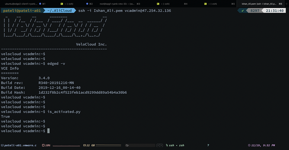 ssh-i private key vcadmin@ Elastic IP of the edge
