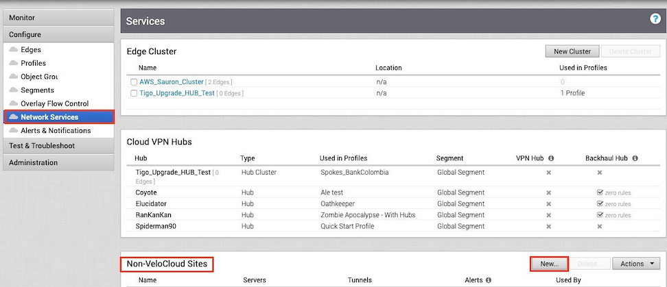 Go to the Configure tab and select Network Services, and then under Non-VeloCloud Sites, select the New button.