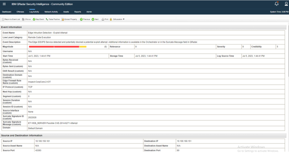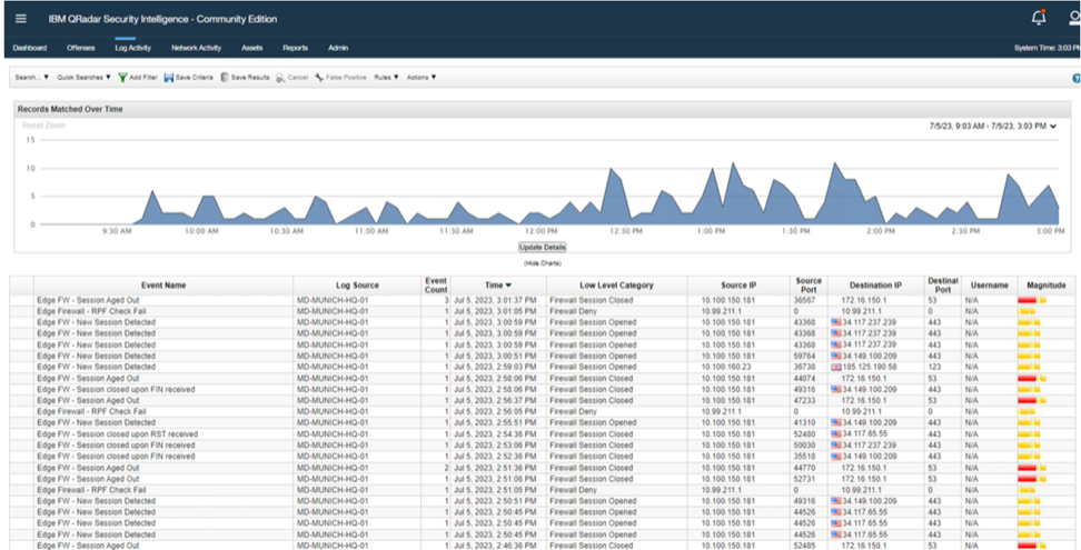 The following images are examples of an IBM QRadar instance receiving logs from an Edge device.