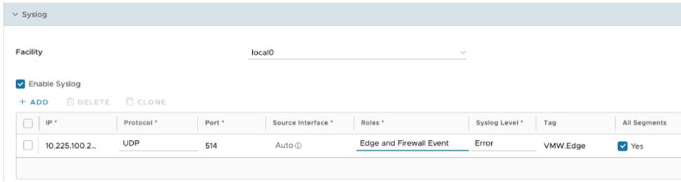 Companies with an existing central log server, SIEM, or SOAR can export the logs via syslog into those solutions. The following image depicts the syslog configuration. You can configure the feature at the Profile or Edge level. It is important to note that syslog traffic is not encrypted.