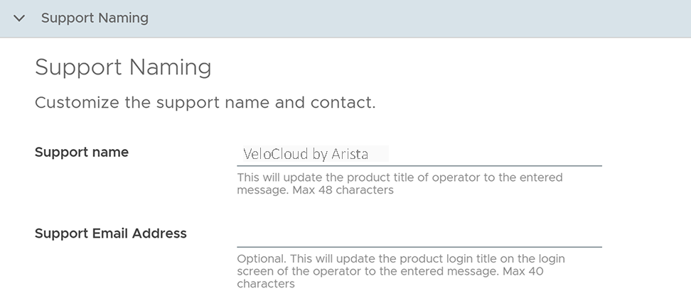 | Support Name | Enter your custom support name. This updates the product title of Operator to the entered text. The support name can be a maximum of 48 characters. |