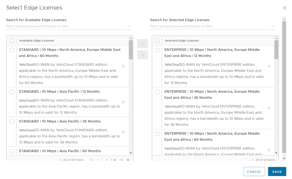 - In the Select Edge Licenses window, choose the relevant licenses based on the Bandwidth, Term, Edition, and Region, and then move them to the Selected Edge Licenses pane.