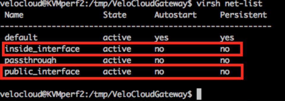 velocloud@KVMperf2:/tmp/VeloCloudGateway$ virsh autostart test_vcg - Start VM.