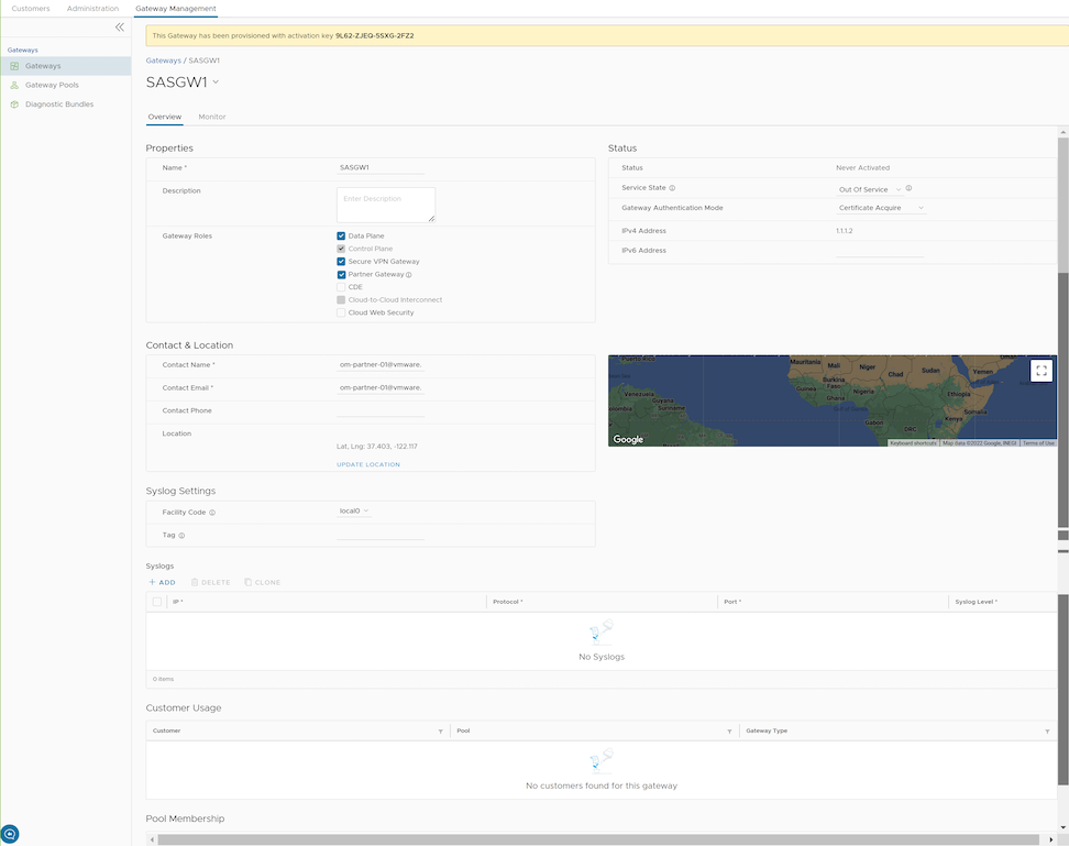 - Create SD-WAN Gateway on SASE Orchestrator and make a note of the activation key.