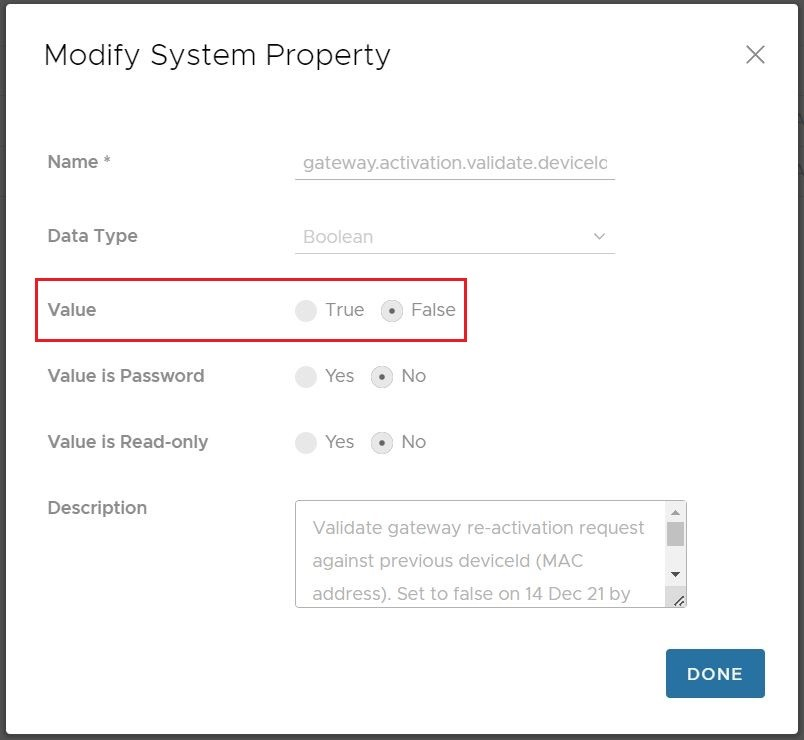 Before you can use this Gateway replacement method, you must adjust the system property gateway.activation.validate.deviceID and set the value to false. To do this you or another Operator with a Superuser role must go to and search for gateway.activation and inspect gateway.activation.validate.deviceID. If the Value is already false as in the screenshot below, then you are ready for the next steps. If the Value is true, then a Gateway reactivation will not work, and you need to modify this system property by selecting it.