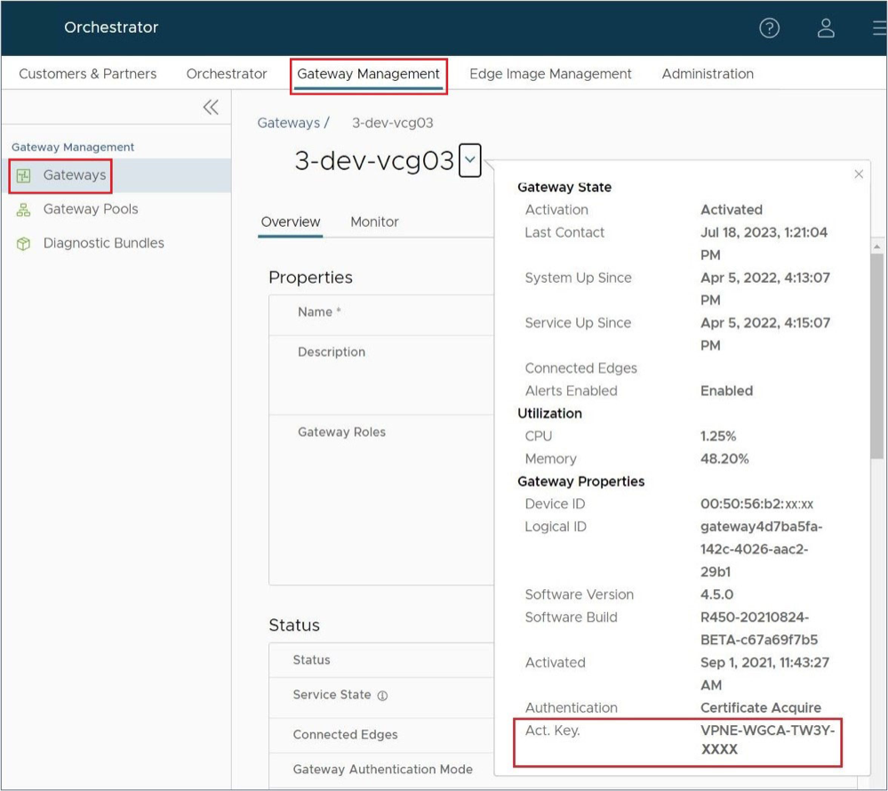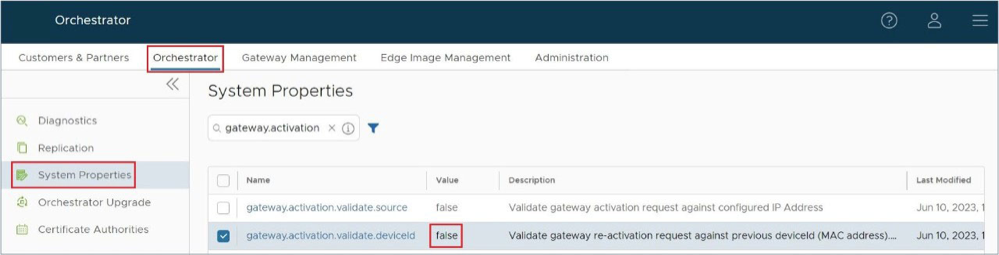 gateway.activation.validate.deviceID system property is set to False and find that you cannot reactivate your Partner Gateway, you can reach out to the Arista Support team and they will assist you in changing that system property on your Orchestrator.These are the steps to activate a replacement Partner Gateway:
