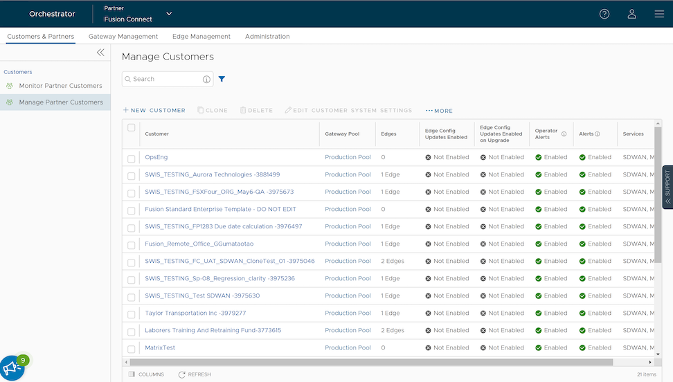 Table 1. Actions Option Description Search Enter a search term to search for the matching text across the table. Use the advanced search option to narrow down the search results. New Customer Select this option to add a new Customer. For additional information, see Create New Partner Customer. Clone Clones the existing configurations of the selected Customer. You can select any of the additional clone attributes. For additional information see, Clone Partner Customer. Delete Deletes the selected Customers. Enter the number of selected Customers in the pop-up window and select Delete. Note: Ensure that you have removed all the Edges associated with the selected Customer, before deleting the Customer.Edit Customer System Settings Allows you to edit the system settings for the customer. For additional information, see the Enterprise Settings section in the VeloCloud SD-WAN Administration Guide. Stage to Bastion Select to stage a Customer to the Bastion Orchestrator. Note: Stage to Bastion and Unstage from Bastion options are available only when the Bastion Orchestrator feature is activated using thesession.options.enableBastionOrchestratorsystem property.For additional information, see Bastion Orchestrator Configuration Guide.