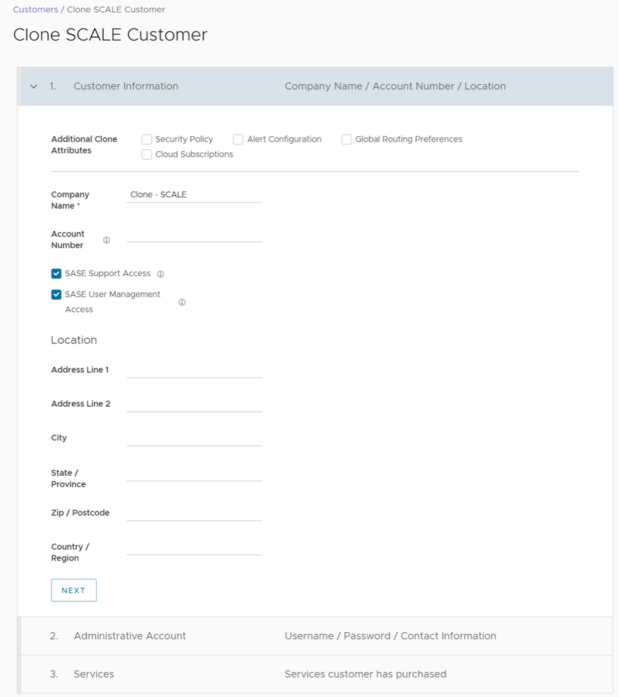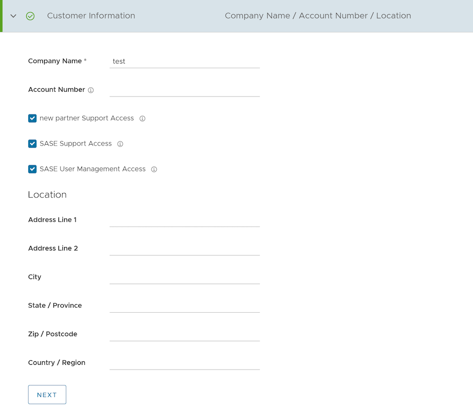 Enter the details in the following fields and select Next.Note: The Next button is activated only when you enter all the mandatory details.Table 4. Customer Details Option Description Company Name Enter your company name. Account Number Enter a unique identifier for the Customer. New Partner Support Access Select the checkbox to allow the new Partner to view, configure, and troubleshoot the Customer's Edges. SASE Support Access This checkbox is selected by default, and grants access to the VeloCloud SD-WAN Support to view, configure, and troubleshoot the Edges connected to the Customer. For security reasons, the Support cannot access or view the user identifiable information.