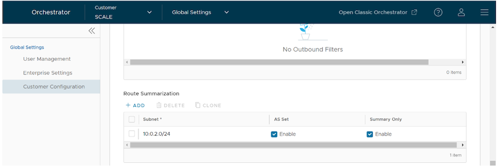 Customer ASN Enter the Customer Autonomous System Number. Hand Off Interface: You can configure the following settings for IPv4 and IPv6. Local IP Address Enter the Local IP address for the logical Hand Off interface. Use for Private Tunnels Select the check box so that private WAN links connect to the private IP address of the Partner Gateway. If private WAN connectivity is activated on a Gateway, the Orchestrator audits to ensure that the local IP address is unique for each Gateway within an Enterprise. Advertise Local IP Address via BGP Select the check box to automatically advertise the private WAN IP of the Partner Gateway through BGP. The connectivity is provided using the existing Local IP address. Static Routes: You can add, delete, or clone a static route. Subnets Enter the IP address of the Static Route Subnet that the Gateway should advertise to the Edge. Cost Enter the cost to apply weightage on the routes. The range is from 0 to 255. Encrypt Select the check box to encrypt the traffic between Edge and Gateway. Hand off Select the hand off type as either VLAN or NAT. Description Enter a descriptive text for the static route. This field is optional. BFD: Turn the toggle button to On to activate this section. Peer Address Enter the IP address of the remote peer to initiate a BFD session. Detect Multiplier Enter the detection time multiplier. The remote transmission interval is multiplied by this value to determine the detection timer for connection loss. The range is from 3 to 50. Receive Interval Enter the minimum time interval, in milliseconds, at which the system can receive the control packets from the BFD peer. The range is from 300 to 60000 milliseconds. Local Address Enter a locally configured IP address for the peer listener. This address is used to send the packets. Transmit Interval Enter the minimum time interval, in milliseconds, at which the system can send the control packets from the BFD peer. The range is from 300 to 60000 milliseconds. BGP: Turn the toggle button to On to activate this section. Neighbor IP Enter the IP address of the configured BGP neighbor network. Secure BGP Routes Select the check box to allow encryption for data-forwarding over BGP routes. Max-hop Enter the number of maximum hops to allow multi-hop for the BGP peers. The range for Max-hop is from 1 to 255, and the default value is 1. Note: This field is available only for eBGP neighbors, when the local ASN and the neighboring ASN are different.Next Hop IP Enter the next-hop IP address to be used by BGP to reach the multi-hop BGP peer. Note: This option is available only for multi-hop eBGP with Max-hop count greater than 1.Neighbor-ASN Enter the Autonomous System Number of the Neighbor network. BGP Local IP Local IP address is the equivalent of a loopback IP address. Enter an IP address that the BGP neighborships can use as the source IP address for the outgoing BGP packets. If you do not enter any value, the IP address of the Hand Off Interface is used as the source IP address. BGP Inbound Filters Displays the BGP inbound filters. BGP Outbound Filters Displays the BGP outbound filters. BGP Optional Settings BFD Select the check box to subscribe to the BFD session. Router-ID Enter the Router ID to identify the BGP Router. Keep Alive Enter the BGP Keep Alive time in seconds. The default timer is 60 seconds. Hold Timers Enter the BGP Hold time in seconds. The default timer is 180 seconds. Turn off AS-PATH Carry Over Select the check box to turn off AS-PATH carry over, which influences the outbound AS-PATH to make the L3-routers prefer a path towards a PE. If you select this option, ensure to tune your network to avoid routing loops. It is recommended not to select this check box. MD5 Auth Select the check box to activate BGP MD5 authentication. This option is used in a legacy network or federal network, and is used as a security guard for BGP peering. MD5 Password Enter a password for MD5 authentication. Note: Starting from the 4.5 release, the use of the special character "<" in the password is no longer supported. In cases where users have already used "<" in their passwords in previous releases, they must remove it to save any changes on the page.Route Summarization is new for the 5.2 release. For an overview, use case, and black hole routing details for Route Summarization, see the section titled, Route Summarization in the Arista VeloCloud SD-WAN Administration Guide. For Route Summarization configuration details, follow these steps: