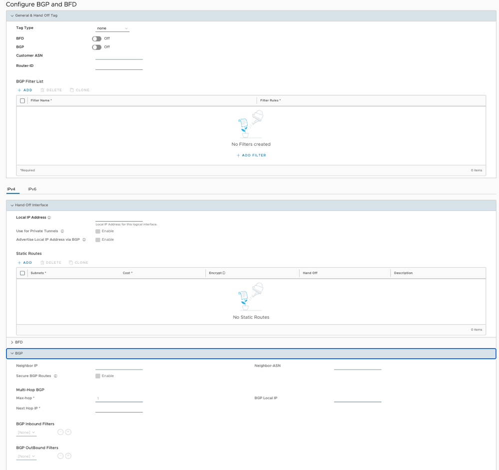 Customer ASN Enter the Customer Autonomous System Number. Hand Off Interface: You can configure the following settings for IPv4 and IPv6. Local IP Address Enter the Local IP address for the logical Hand Off interface. Use for Private Tunnels Select the check box so that private WAN links connect to the private IP address of the Partner Gateway. If private WAN connectivity is activated on a Gateway, the Orchestrator audits to ensure that the local IP address is unique for each Gateway within an Enterprise. Advertise Local IP Address via BGP Select the check box to automatically advertise the private WAN IP of the Partner Gateway through BGP. The connectivity is provided using the existing Local IP address. Static Routes: You can add, delete, or clone a static route. Subnets Enter the IP address of the Static Route Subnet that the Gateway should advertise to the Edge. Cost Enter the cost to apply weightage on the routes. The range is from 0 to 255. Encrypt Select the check box to encrypt the traffic between Edge and Gateway. Hand off Select the hand off type as either VLAN or NAT. Description Enter a descriptive text for the static route. This field is optional. BFD: Turn the toggle button to On to activate this section. Peer Address Enter the IP address of the remote peer to initiate a BFD session. Detect Multiplier Enter the detection time multiplier. The remote transmission interval is multiplied by this value to determine the detection timer for connection loss. The range is from 3 to 50. Receive Interval Enter the minimum time interval, in milliseconds, at which the system can receive the control packets from the BFD peer. The range is from 300 to 60000 milliseconds. Local Address Enter a locally configured IP address for the peer listener. This address is used to send the packets. Transmit Interval Enter the minimum time interval, in milliseconds, at which the system can send the control packets from the BFD peer. The range is from 300 to 60000 milliseconds. BGP: Turn the toggle button to On to activate this section. Neighbor IP Enter the IP address of the configured BGP neighbor network. Secure BGP Routes Select the check box to allow encryption for data-forwarding over BGP routes. Max-hop Enter the number of maximum hops to allow multi-hop for the BGP peers. The range for Max-hop is from 1 to 255, and the default value is 1. Note: This field is available only for eBGP neighbors, when the local ASN and the neighboring ASN are different.Next Hop IP Enter the next-hop IP address to be used by BGP to reach the multi-hop BGP peer. Note: This option is available only for multi-hop eBGP with Max-hop count greater than 1.Neighbor-ASN Enter the Autonomous System Number of the Neighbor network. BGP Local IP Local IP address is the equivalent of a loopback IP address. Enter an IP address that the BGP neighborships can use as the source IP address for the outgoing BGP packets. Note: The BGP Local IP address must be from a different subnet than a handoff IP address.If you do not enter any value, the IP address of the Hand Off Interface is used as the source IP address.