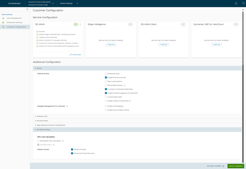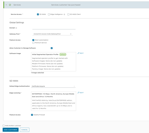 Table 6. Services Option Descriptions Option Description Domain Enter the domain name to be used to enable Single Sign On (SSO) authentication for the Orchestrator. This is also required to activate Edge Network Intelligence for the Customer. Gateway Pool Select an existing Gateway pool from the drop-down list. For additional information, see Manage Gateway Pools. Feature Access You can select either Role Customization or Premium Service, or both the check boxes. Allow Customer to Manage Software Select the check box if you want to allow an Enterprise Super User to manage the software images available for the Enterprise. Once selected, the Software Image filed is displayed. Select Add and in the Select Software/Firmware Images pop-up window, select and assign the software/firmware images from the available list for the Enterprise. Select Done to add the selected images to the Software Image list. Note: You can remove an assigned image from an Enterprise, only if the image is not currently used by any Edge within the Enterprise.Operator Profile Select an Operator profile to be associated with the Customer from the available drop-down list. This field is not available if Allow Customer to Manage Software is selected. For additional information on Operator profiles, see the "Manage Operator Profiles" section in the Arista VeloCloud SD-WAN Operator Guide. Service Access: This option is available above the global settings. You can choose the services that the Customer can access along with the roles and permissions available for the selected service.Note: This option is available only when the system propertysession.options.enableServiceLicensesis set asTrue. - The SD-WAN service allows you to configure the following options:
