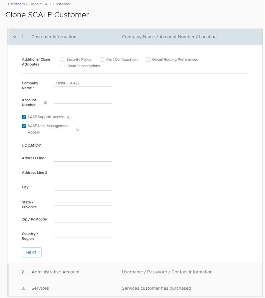 SASE User Management Access Select the check box to allow the Arista Support to assist in User Management. The User Management includes options to create users, reset password, and configure other settings. In this case, the Support has access to user identifiable information. Location Enter relevant address details in the respective fields. - Enter the Administrative Account details in the following fields and select Next.