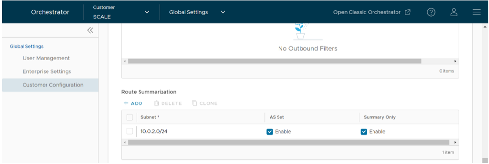 For an overview, use case, and black hole routing details for Route Summarization, see the section titled, Route Summarization in the Arista VeloCloud SD-WAN Administration Guide.Table 12. Route Summarization Option Descriptions Option Description +Add Select +Add to add a new row in the Route Summarization area. Note: To add additional rows to configure Route Summarization, select +Add. To Clone or Delete a route summarization, use the appropriate buttons, located next to +Add.Subnet column Under the Subnet column, enter the IP subnet. AS Set column Generate AS set path information from the summarized routes (while advertising the summarized route to the peer). Under the AS Set column, select the Yes check box if applicable. Summary Only column Under the Summary Only column, select the Yes check box to allow only the summarized route to be sent. - Select Update to save the settings.