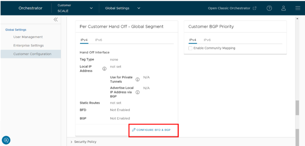 Table 10. Partner Hand Off Option Descriptions Option Description Configure Hand Off By default, the hand off configuration is applied to all the Gateways. If you want to configure a specific Gateway, choose Per Gateway, and then select the Gateway from the drop-down list. Segment By default, Global Segment is selected, which means that the hand off configuration is applied to all the segments. If you want to configure a specific segment, select the segment from the drop-down menu. Hand Off Interface This section displays the values that are configured on the Configure BGP and BFD page. Customer BGP Priority Select the check box and configure the Community Mapping details. - At the bottom of the Per Customer Hand Off – Global Segment area, select the Configure BFD & BGP link, as shown in the following image.