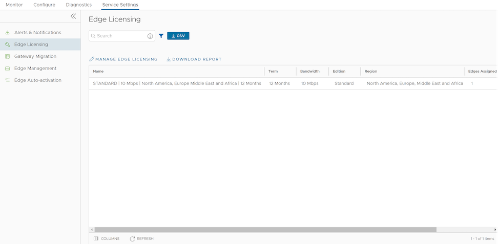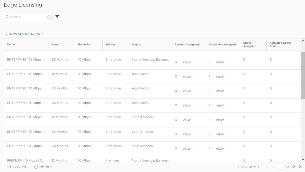 Table 1. Edge Licensing Option Descriptions Option Description Search Enter a term to search for a matching text across the table. You can select the advanced search option to use filters to narrow down the search results. Download Report Select this option to download a report of the licenses, associated customers, and Edges in a CSV format. Columns Select this option and select the columns to be displayed in the table. Refresh Select this option to refresh the displayed list of licenses. - Selecting the View link under the Partners assigned column, displays the Edge license details of the selected Partner.