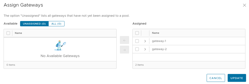Gateways can be organized into pools that are then assigned to a network. An unpopulated default Gateway pool is available after you install Orchestrator. If required, you can create additional Gateway pools.