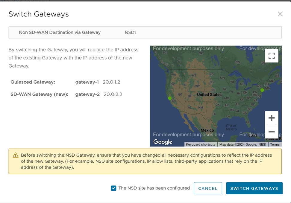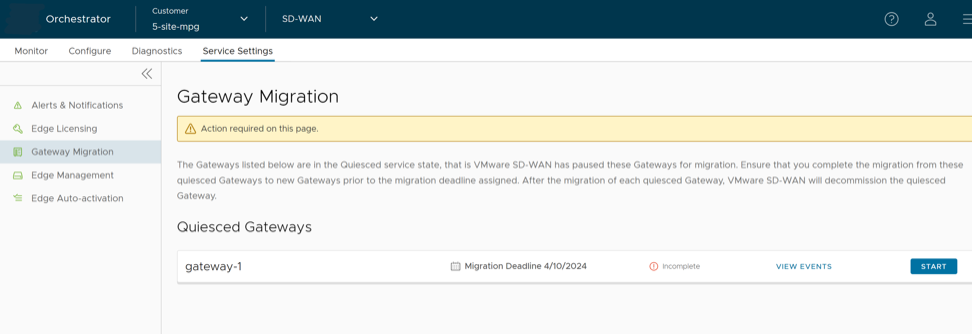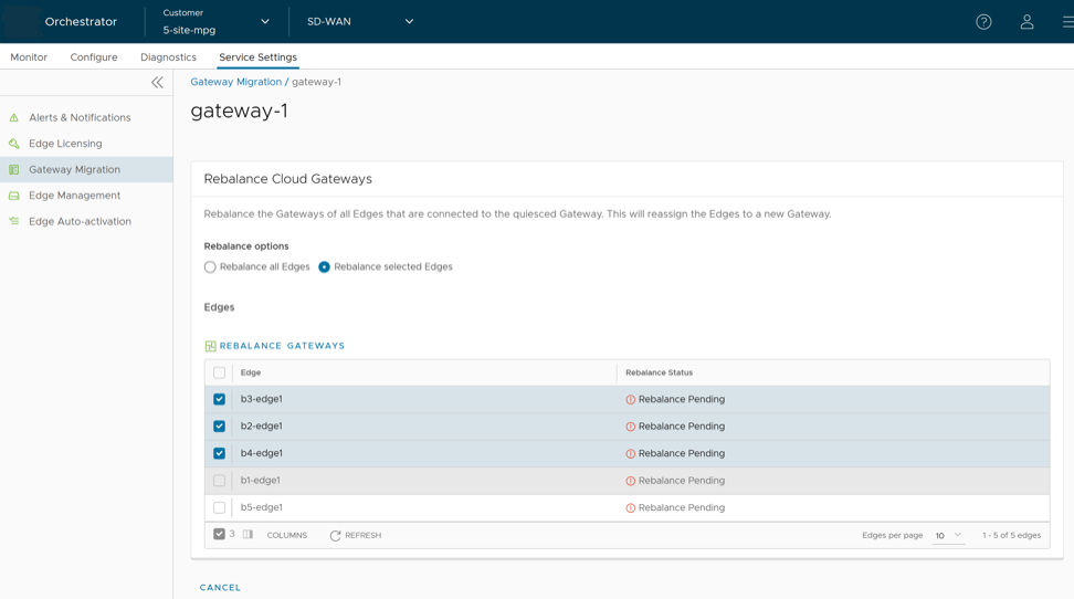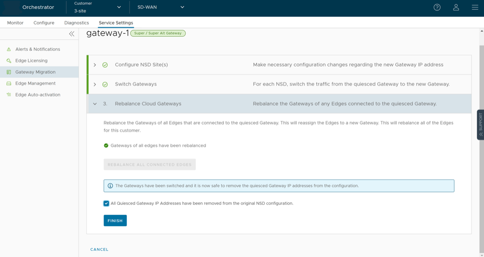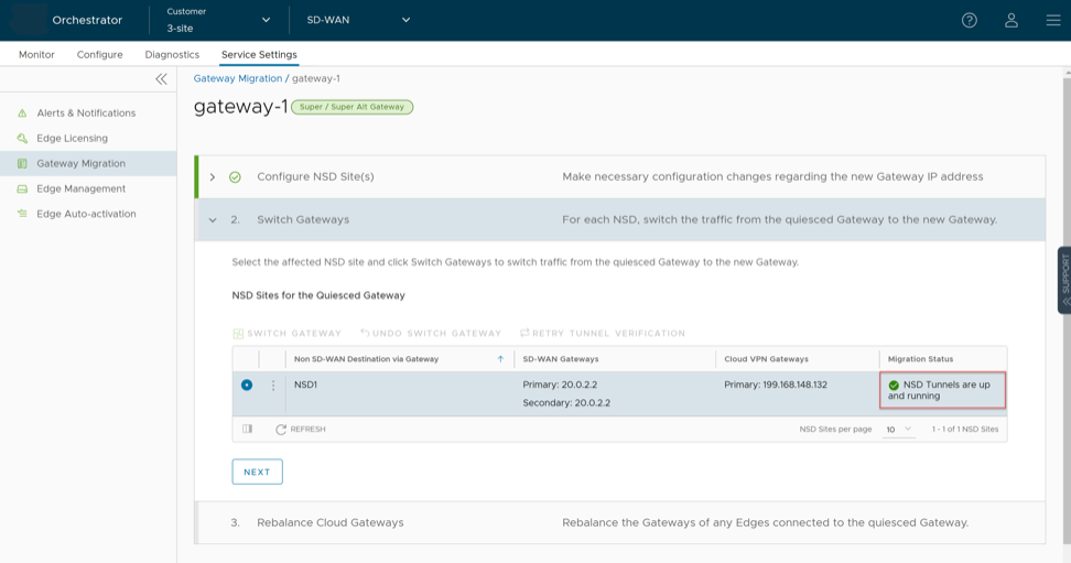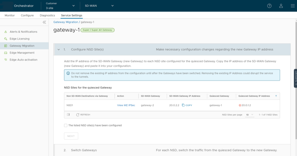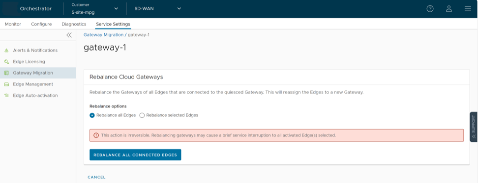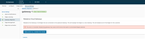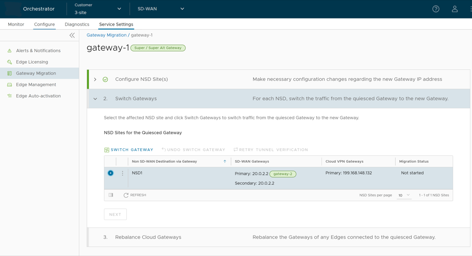 - There will be a minimum service disruption based on the time taken to switch Non SD-WAN Destinations (NSDs) from the quiesced Gateway to the new Gateway and to rebalance the Edges connected to the quiesced Gateway.