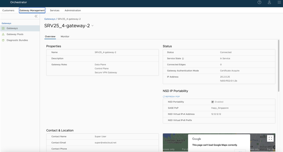 Gateways are configured with specific roles. For example, a Gateway with data plane role is used to forward data plane traffic from source to destination. Similarly, a Gateway with Control Plane role is called a Super Gateway and is assigned to an Enterprise. Edges within the Enterprise are connected to the Super Gateway. Also, there is a Gateway with Secure VPN role that is used to establish an IPSec tunnel to a Non SD-WAN destination (NSD). The migration steps may vary based on the role configured for the Gateway. For more information about the Gateway roles, see the “Configure Gateways” section in the VeloCloud SD-WAN Operator Guide.