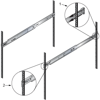 Each end of an assembled rail contains two rack plugs. Insert the plugs into the rack slots to install the rails into a rack. When installing rails into rack posts with threaded or rounded holes, remove all plugs on both sides of the assembled rails and install them with bolts that fit the rack.