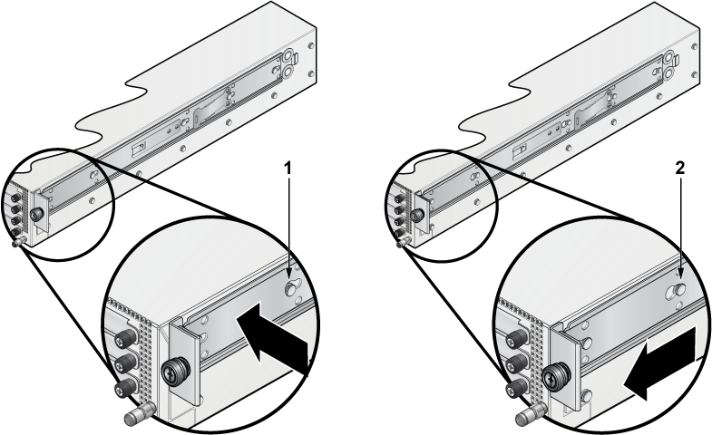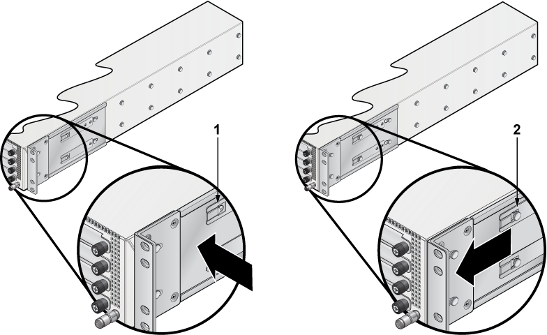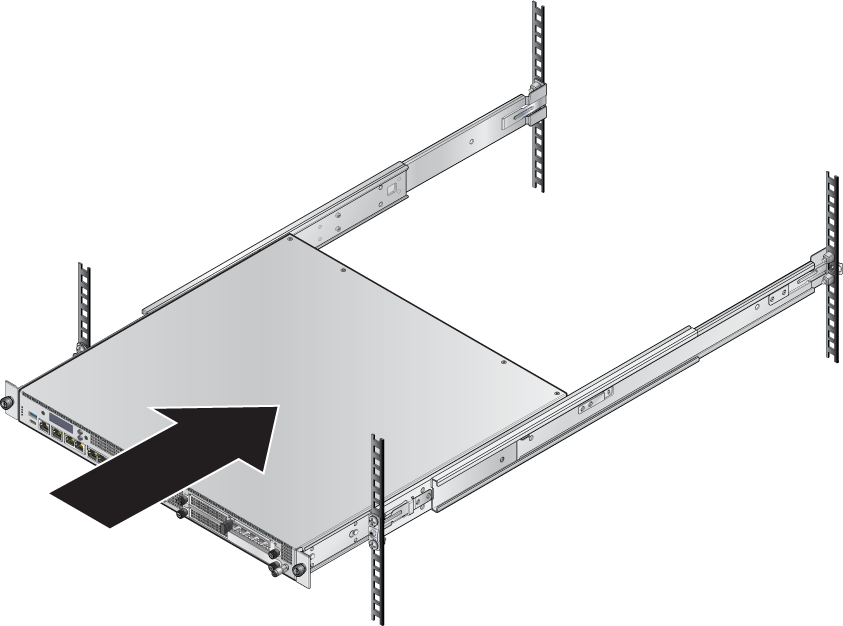 Slide the device into the rack after installing the rails. Each bracket includes a thumb screw that attaches the device to the rail.