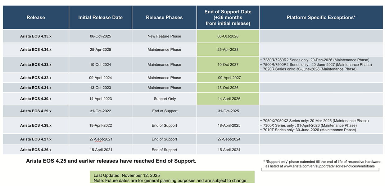 The following table depicts the Arista EOS release support matrix, including the timelines for each major Arista EOS software train (based on the 36 month lifecycle policy) and includes current state of TAC support for each train.
