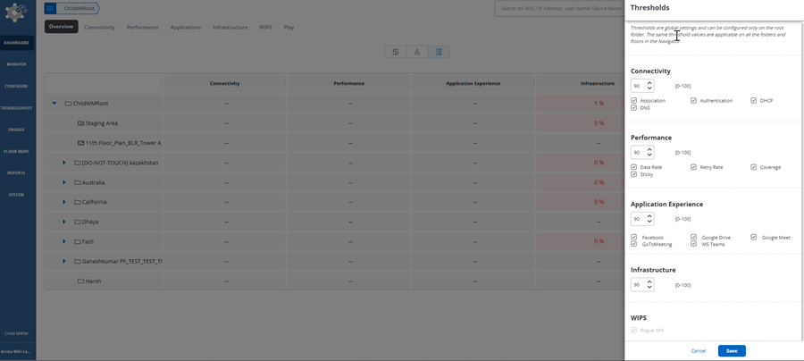 Click the Set Thresholds icon on the SLA Dashboard to configure the following thresholds: Connectivity, Performance, Application Experience, Infrastructure, and WIPS.