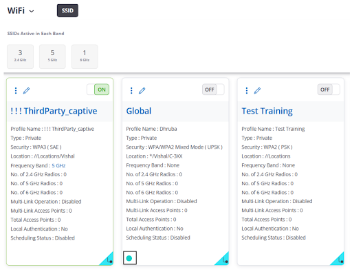 In the Card and Table views, SSIDs with custom attributes (also called Custom SSIDs) are marked with a blue dot for easy identification.