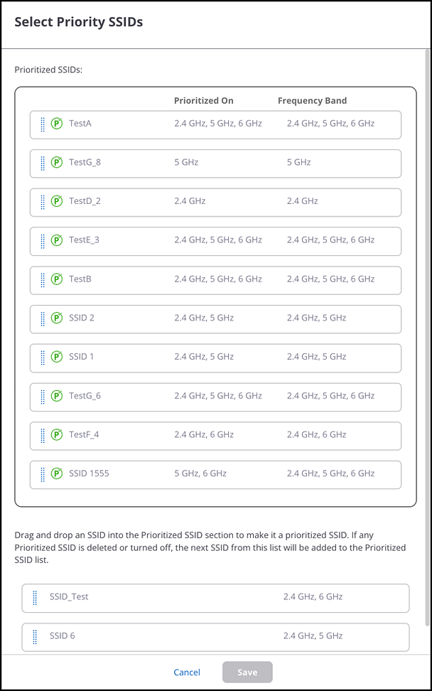 For prioritized SSIDs, it shows the Frequency Bands it is prioritized on and the Frequency Bands it is enabled on. You can drag an SSID from the non-prioritized list to add it to the prioritized list.