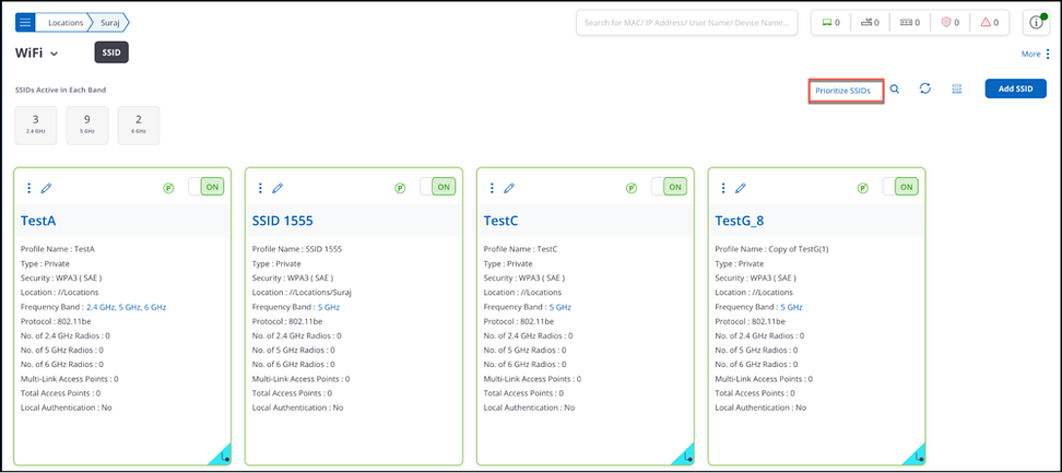 If a prioritized SSID is disabled, the first non-prioritized SSID is automatically promoted to the prioritized list. SSIDs are prioritized on bands with available slots. For example, if 14 SSIDs are active across all bands at a location and a user disables a particular SSID prioritized on the 5GHz band, an empty slot becomes available for the 5GHz band. The first non-priority SSID is then moved to the priority bucket and prioritized on the 5GHz band only.