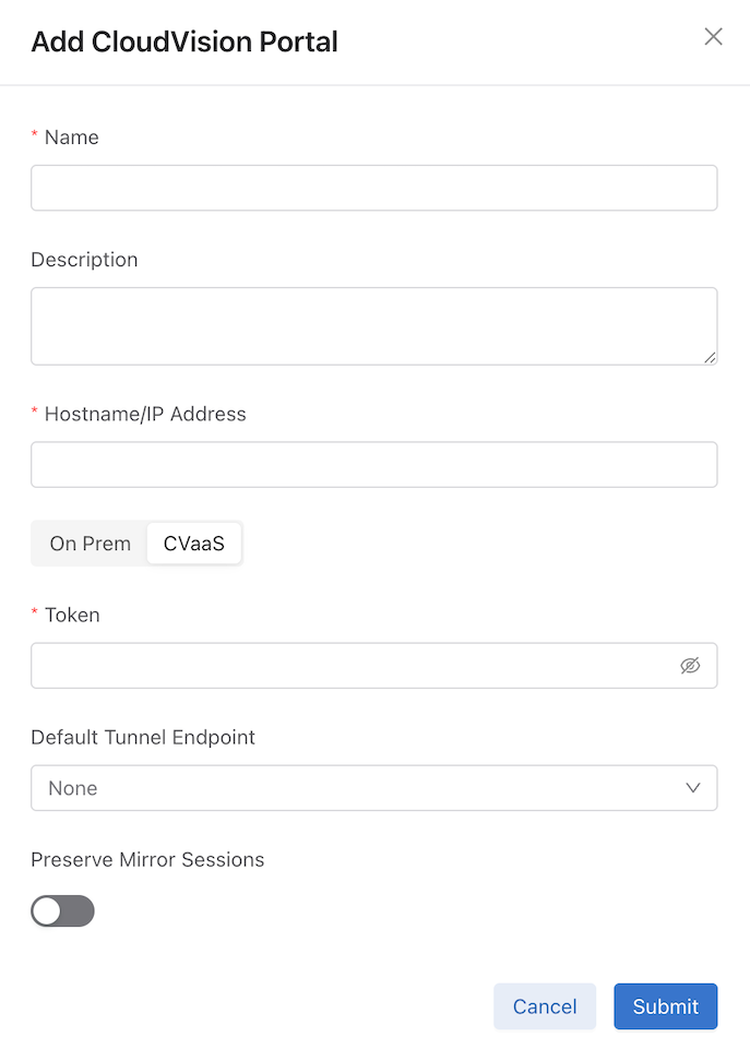Select CVaaS to add a CVaaS integration instance and enter the configuration detailsand select Submit.