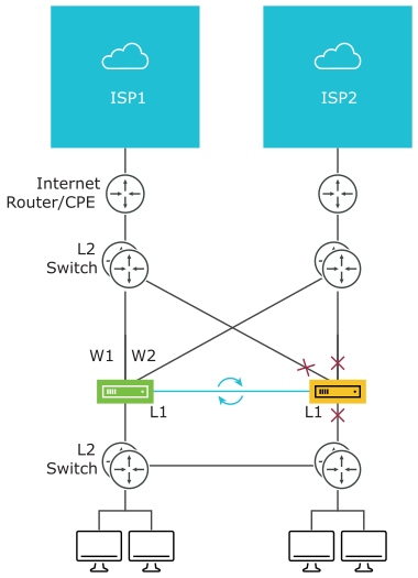 The SD-WAN Edge WAN connections (W1 and W2) are used to connect to L2 switches to provide a WAN connection to ISP1 and ISP2 respectively. The L1 connections on the SD-WAN Edge are connected to provide a failover link for HA support. The Edge LAN connections are used to connect L2 Switches, which have several end-user devices connected.