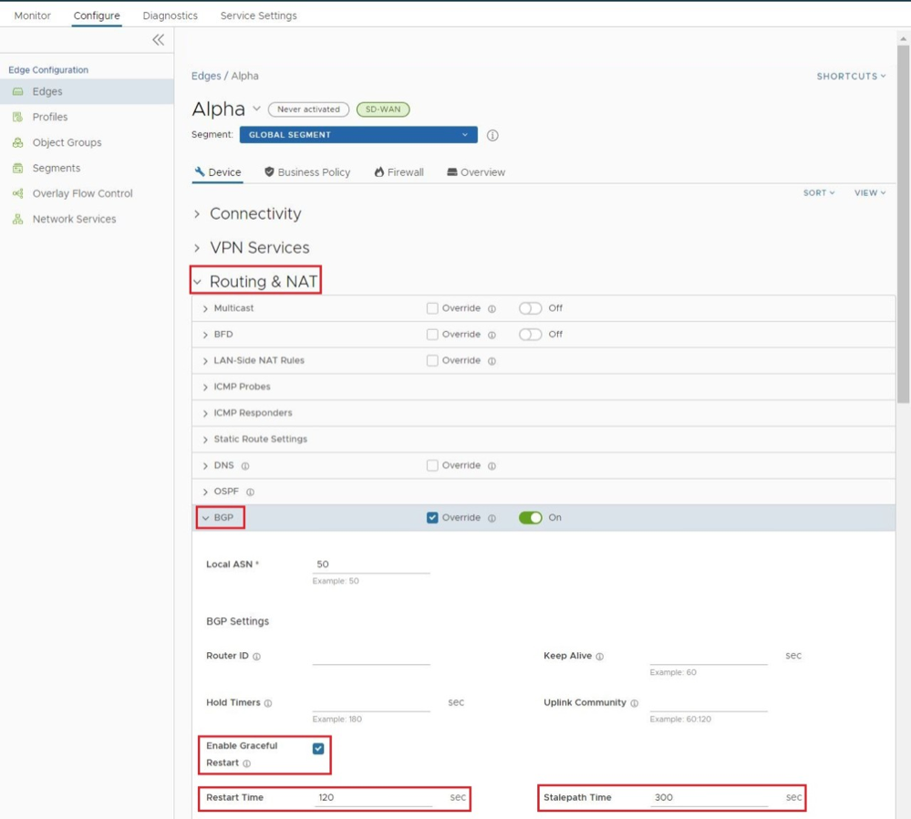- LoS probing is not done on the Interfaces of standby Edge. Hence, any Interface connectivity change on standby Edge cannot be detected.