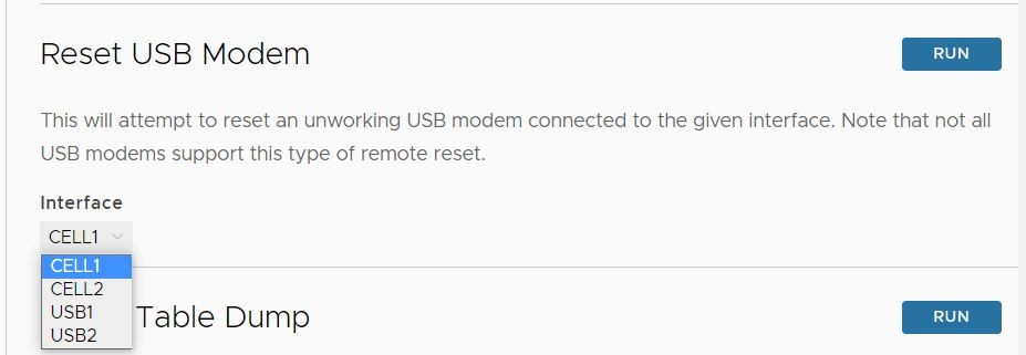 - Reset USB Modem- Run this test on a selected Edge interface to reset an malfunctioning USB modem connected to the given interface.