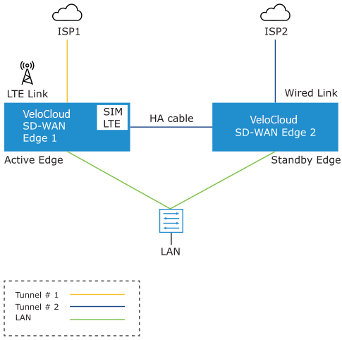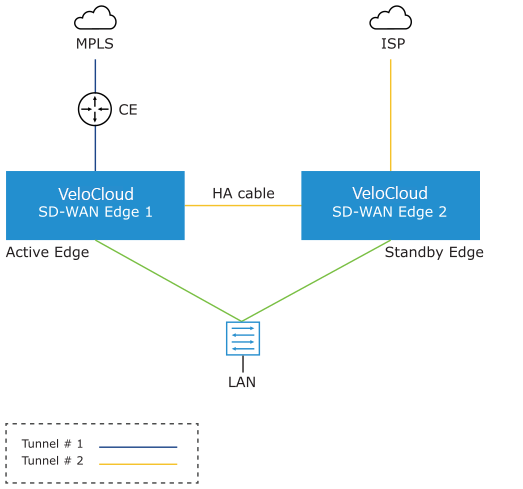 The Edges, one Active and one Standby, are connected by using an HA link to establish a failover link. The Active Edge establishes overlay tunnels on both WAN links (connected to itself and the Standby Edge) through the HA link.