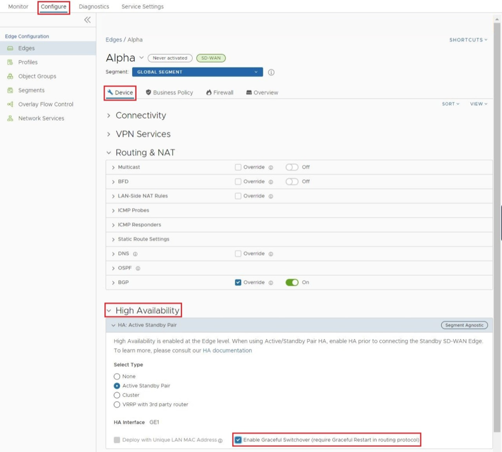 - Re-enable HA and allow the replacement Edge to complete the activation process, assuming the role of the Standby Edge.