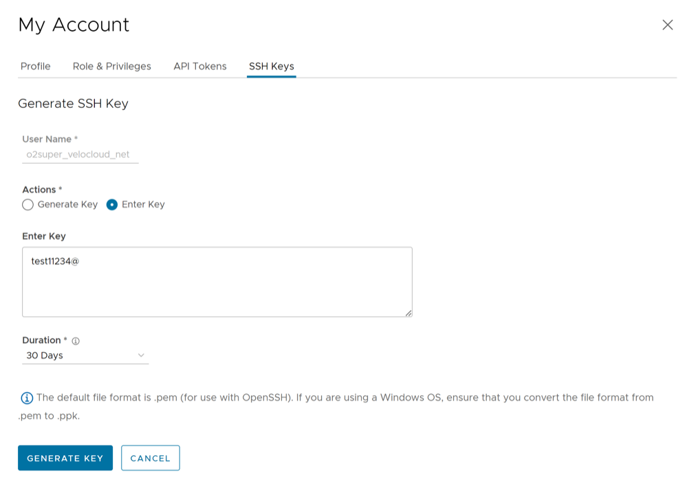 The public key is stored in the database and is shared with the Edges. The private key is downloaded to your computer, and you can use this key along with the SSH username to access Edges. You can generate only one pair of SSH keys at a time. If you need to add a new pair of SSH keys, you must delete the existing pair and then generate a new pair. If a previously generated private key is lost, you cannot recover it from the Orchestrator. You must delete the key and then add a new key to gain access.