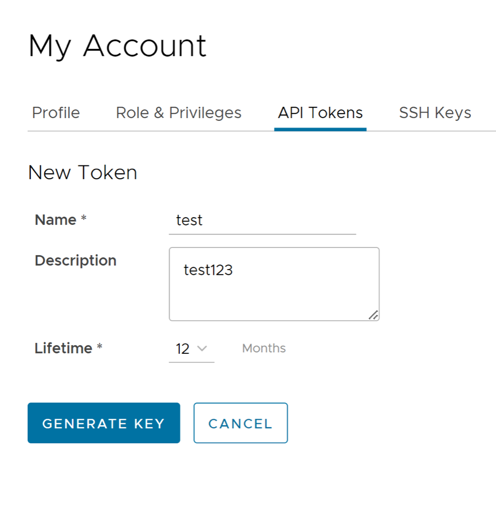 The My Account page allows you to configure basic user information, SSH keys, and API tokens. You can also view the current user's role and the associated privileges.
