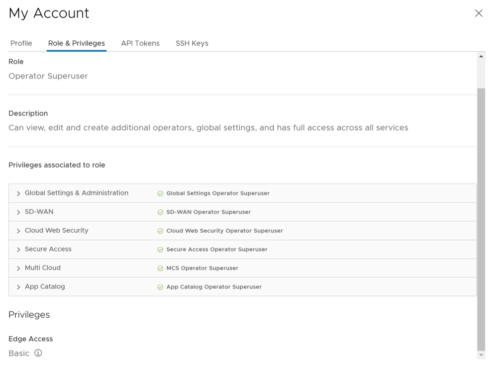 Ensure to configure privileges for a user to access Edges in a secure manner. You must choose Basic access level for the user. You can configure the access level when you create a new user (under User Management), and choose to modify it at a later point in time. Ensure that you have Superuser role to modify the access level for a user.