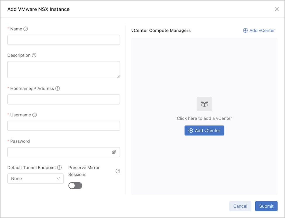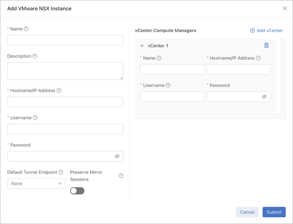 Select Add vCenter to add further configuration details for the vCenter compute manager(s) associated with the NSX Manager.